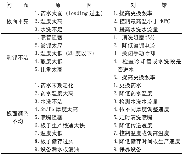 3.铜离子会使得药液中铜保护剂分解,请避免将裸铜板放入槽液中,重工时亦请将线速调高,以残锡能刚好剥除为原则;请每周检查喷嘴是否有堵塞情况,并检查传动系统的顺畅性。