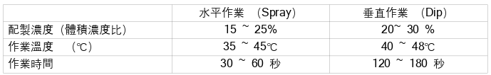 建议採用喷淋方式操作,30~60秒时间便可以把铜表面均匀地清洁去脂。工作槽液的浓度及作业温度会影嚮清洗效果;必要时需把工作槽液的浓度及温度提高。需按有关之分析方法(总酸度分析)定期分析,并视情形补充新液及水以保持工作槽液于最佳作业状态。