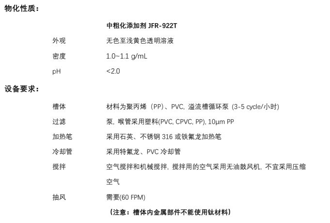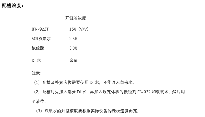 中粗化剂JFR-922T属于硫酸-双氧水体系的微蚀剂,可以使铜面得到均匀一致的微粗化;能够应用在内层、OSP前处理、干膜前处理以及其它微蚀处理上。