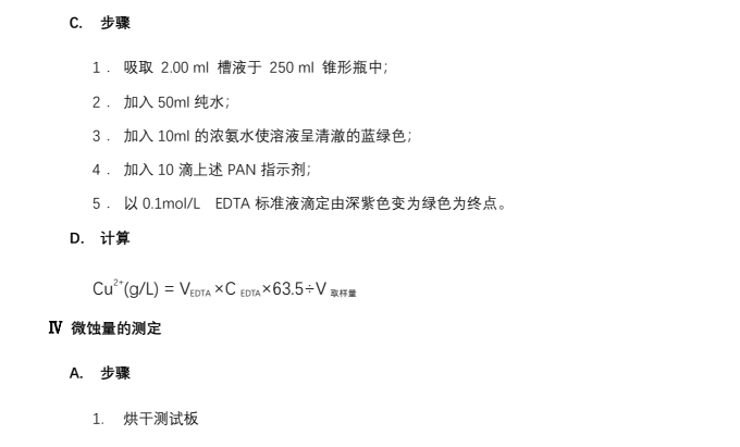 废液理处:用氢氧化钠或生石灰中和废液使铜离子完全沉淀后可同其它废水一起做进一步处理。废液处理参考本方法,但与当地法律法规矛盾时,以当地法律法规为准。