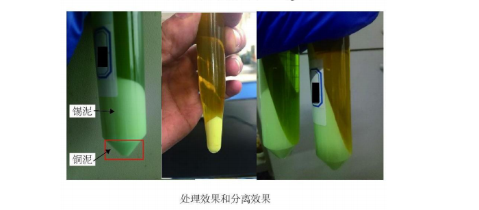 退锡废液主要成分为离子态的锡、铜、铁、悬浮态的水合氧化锡(正锡酸,偏锡酸,氢氧化锡,二氧化锡等)、失效的添加剂以及3.5~4.5mol/L的硝酸。在特性分离剂迫使下,退锡废液中的离子态的锡、铜转化为锡、铜化合物沉淀微粒,并与悬浮态的水合氧化锡发生黏合作用,实现共沉降,再通过自行设计的封闭式高效固液分离系统将锡、铜沉淀微粒分离出去,分离所得沉淀物含锡30%~40%,打包即可当作氢氧化锡产品出售。